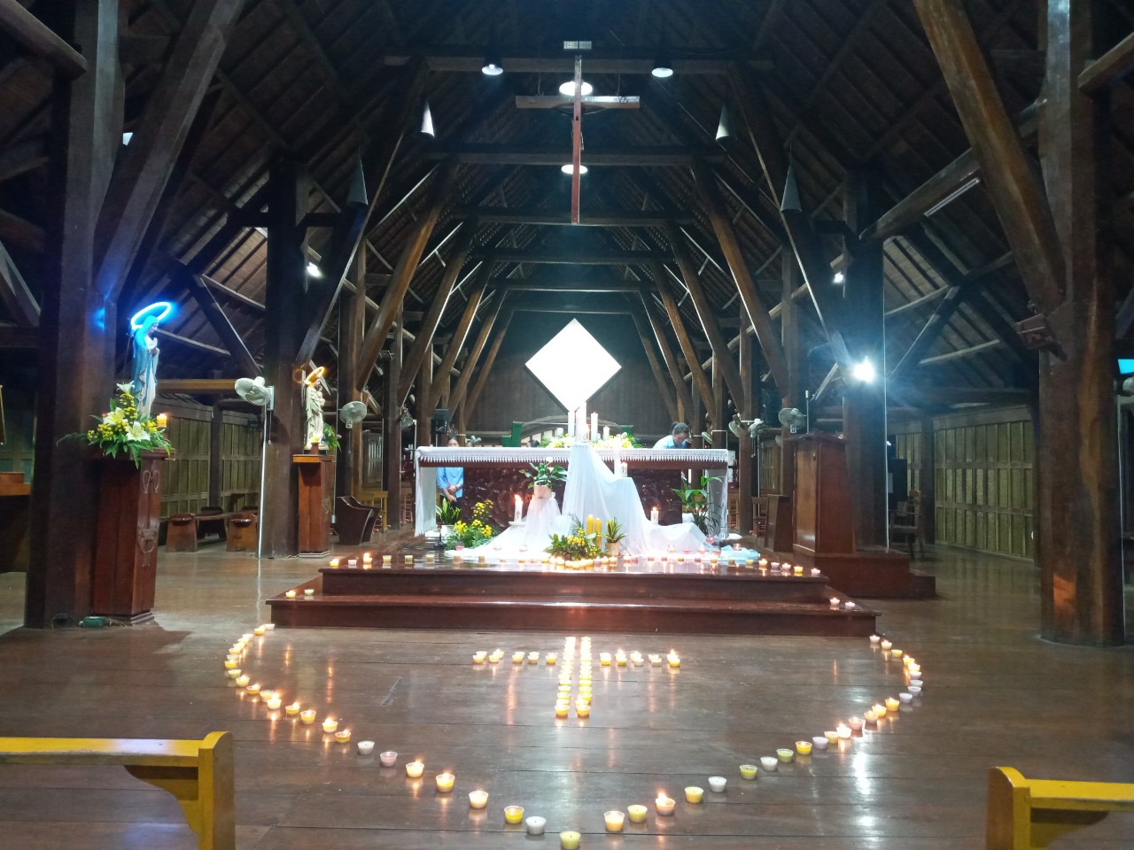 Khung cảnh nhà nguyện lấp lánh những ánh nến xếp hình trái tim và thánh giá với ước mong tình yêu Chúa đến xoa dịu nỗi đau của con người đang trong cuộc chiến.