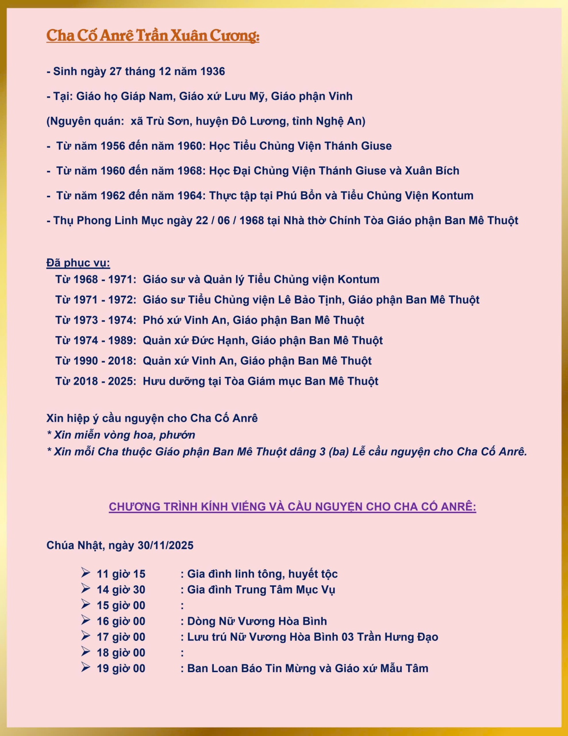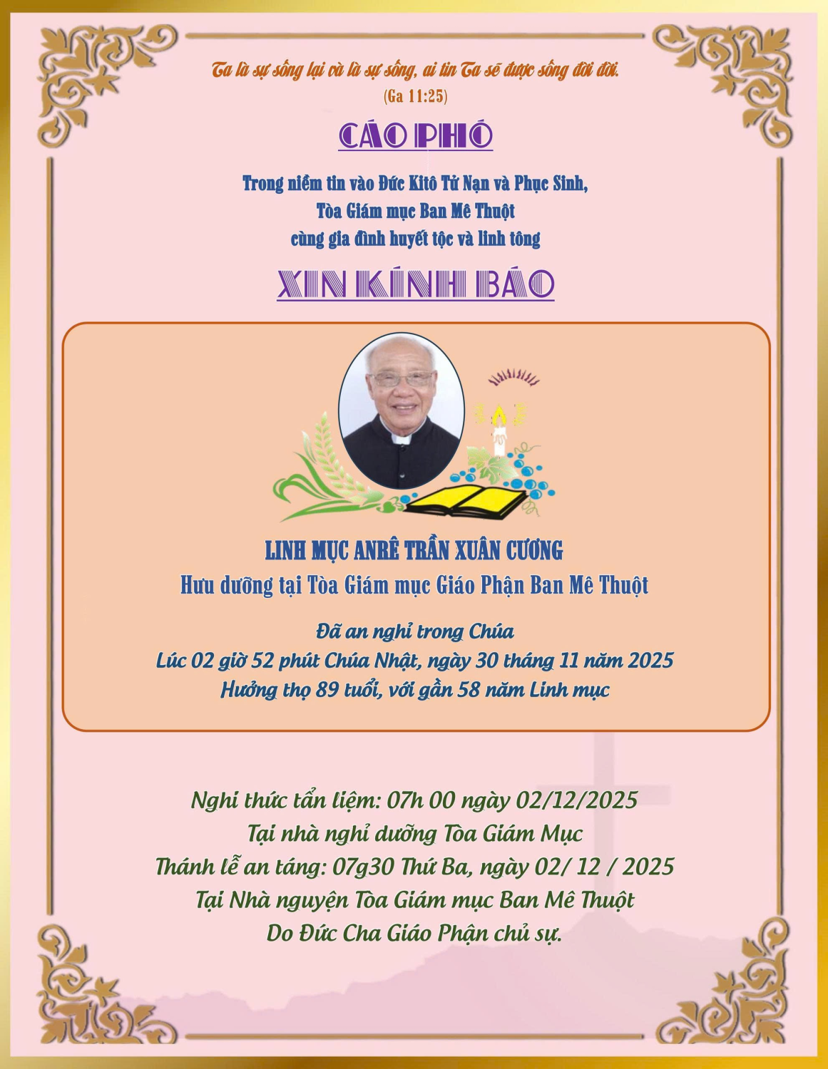 CÁO PHÓ: Linh mục Anrê Trần Xuân Cương