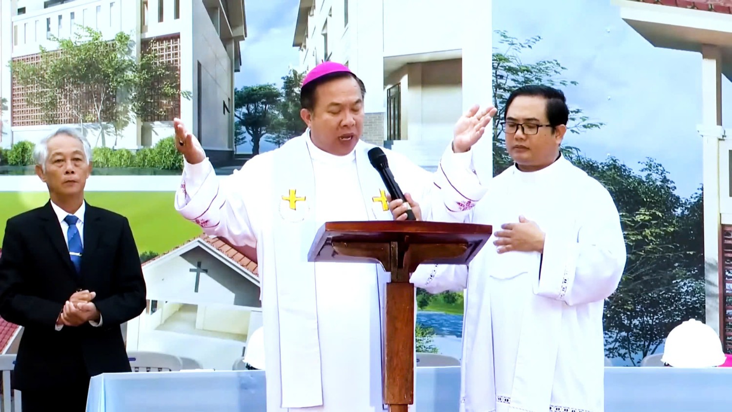 Những xẻng cát tượng trưng này đánh dấu bước đầu cho một công trình để phục vụ dân Chúa được Thiên Chúa chúc phúc. Sau những nghi thức trang trọng, Đức Cha Giáo phận ban huấn từ, ngài nói: “Hôm nay là một ngày đặc biệt đối với Giáo xứ chúng ta. Chúng ta quy tụ về nơi đây thể hiện một sự hiệp nhất, huynh đệ. Một sự cộng tác rất đặc biệt trong ngày khởi công. Sự đoàn tụ không phải chỉ có những người con trong Giáo xứ mà còn có những người con xa quê, điều đó cho thấy một sự keo sơn, gắn bó. Vì thế, công trình xây dựng không đơn giản là vật chất, mà còn là sự thể hiện tinh thần hiệp nhất trong cộng đoàn Giáo xứ, Giáo hội… Xin cho công trình sớm hoàn thành và được Thiên Chúa chúc lành ban bình an.”