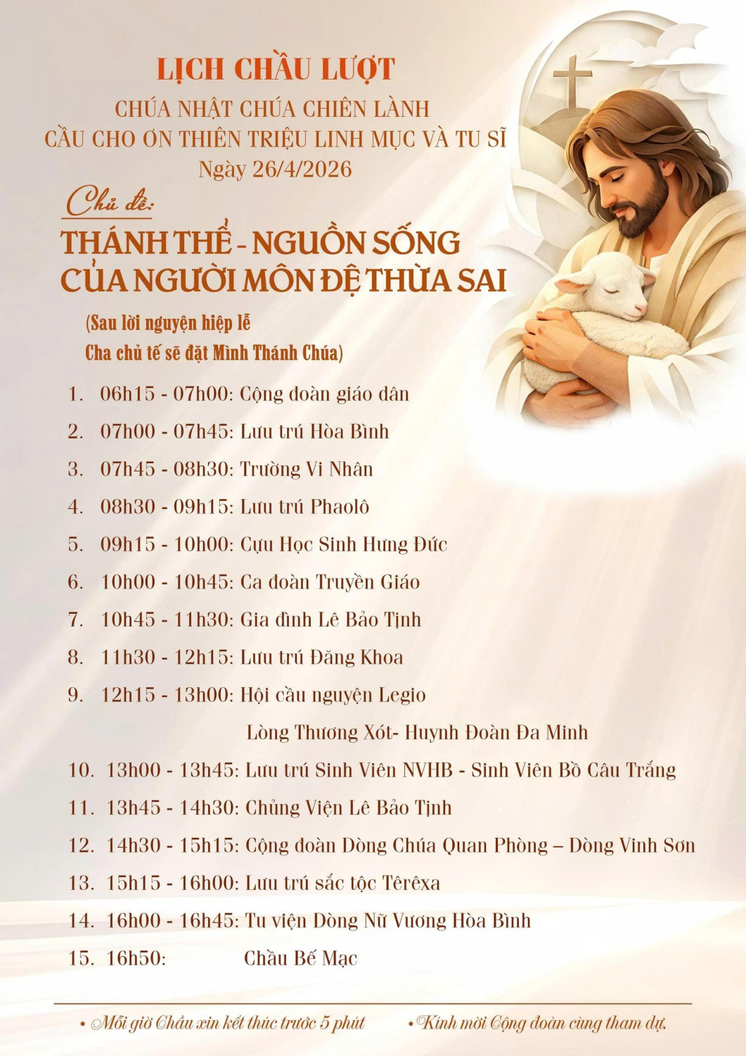 Lịch Chầu lượt Chúa Nhật Chúa Chiên Lành - Ngày 26/4/2026 tại Nhà Nguyện Tòa Giám Mục BMT