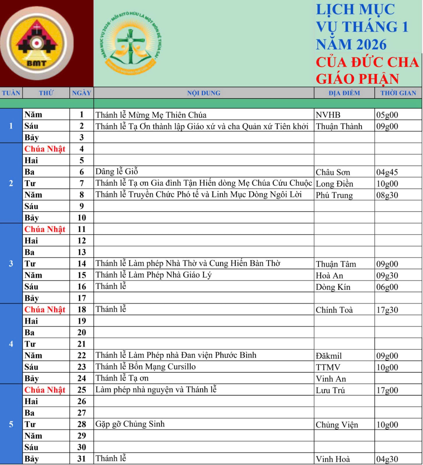 Lịch mục vụ tháng 01.2026 của Đức Giám Mục