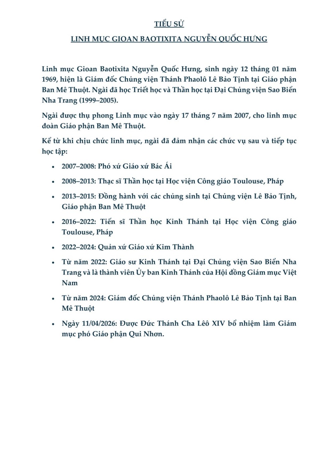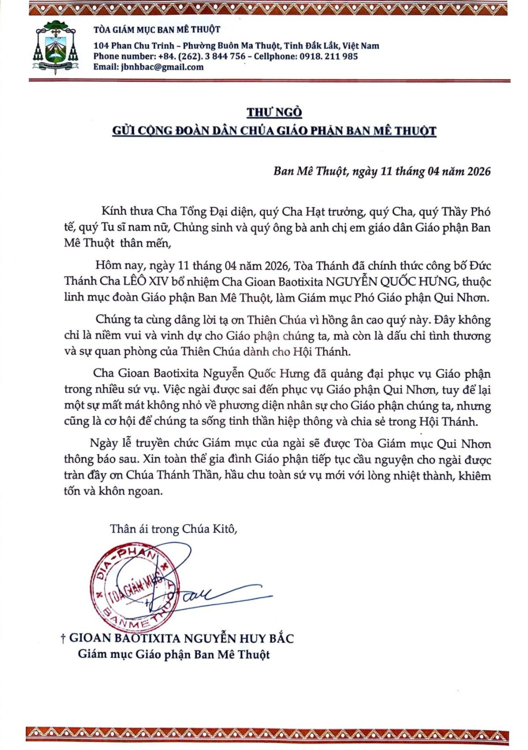 Hôm nay, ngày 11 tháng 04 năm 2026, Tòa Thánh đã chính thức công bố Đức Thánh Cha LÊÔ XIV bổ nhiệm Cha Gioan Baotixita NGUYỄN QUỐC HƯNG, thuộc linh mục đoàn Giáo phận Ban Mê Thuột, làm Giám mục Phó Giáo phận Qui Nhơn.