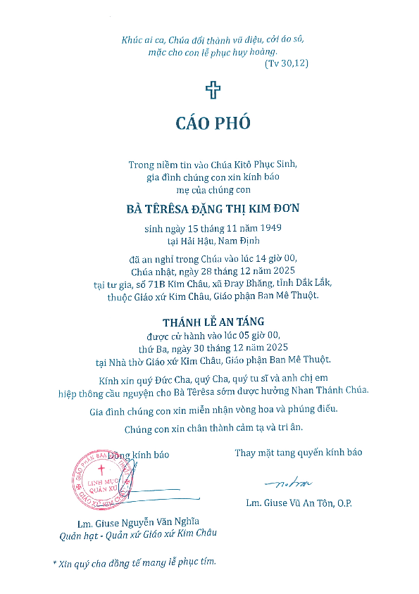 Kính xin quý Đức Cha, quý Cha, quý tu sĩ và anh chị em
