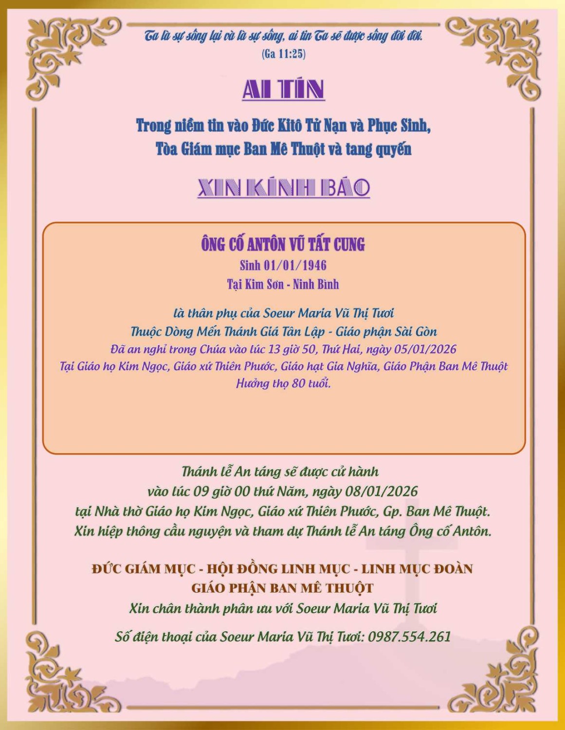 Đã an nghỉ trong Chúa vào lúc 13 giờ 50, Thứ Hai, ngày 05/01/2026
