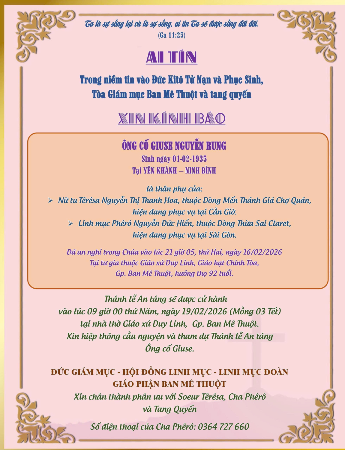 Tại tư gia thuộc Giáo xứ Duy Linh, Giáo hạt Chính Tòa, Gp. Ban Mê Thuột, hưởng thọ 92 tuổi.
