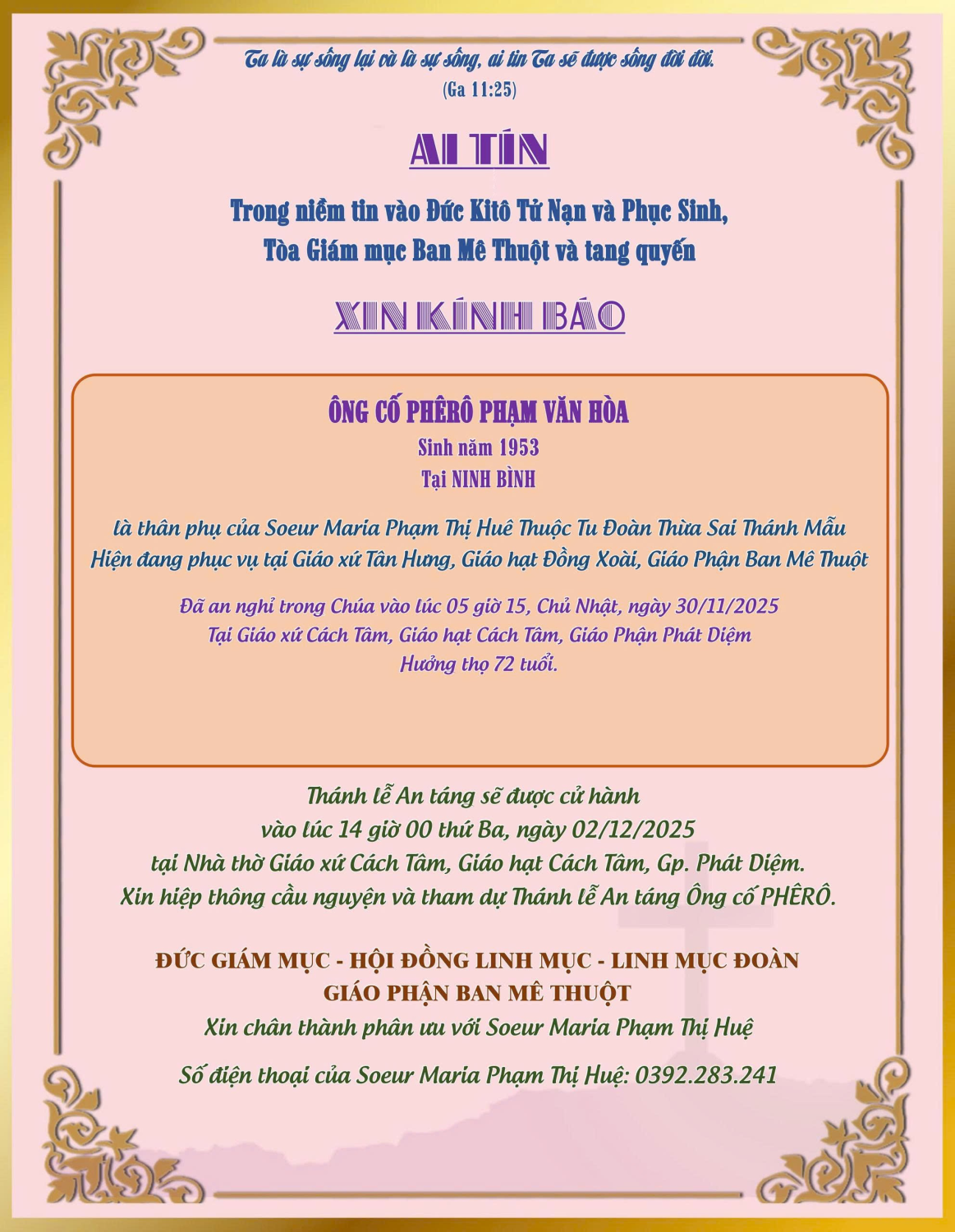 Thân phụ Soeur Maria Phạm Thị Huệ, thuộc Tu Đoàn Thừa Sai Thánh Mẫu; hiện đang phục vụ tại Gx Tân Hưng