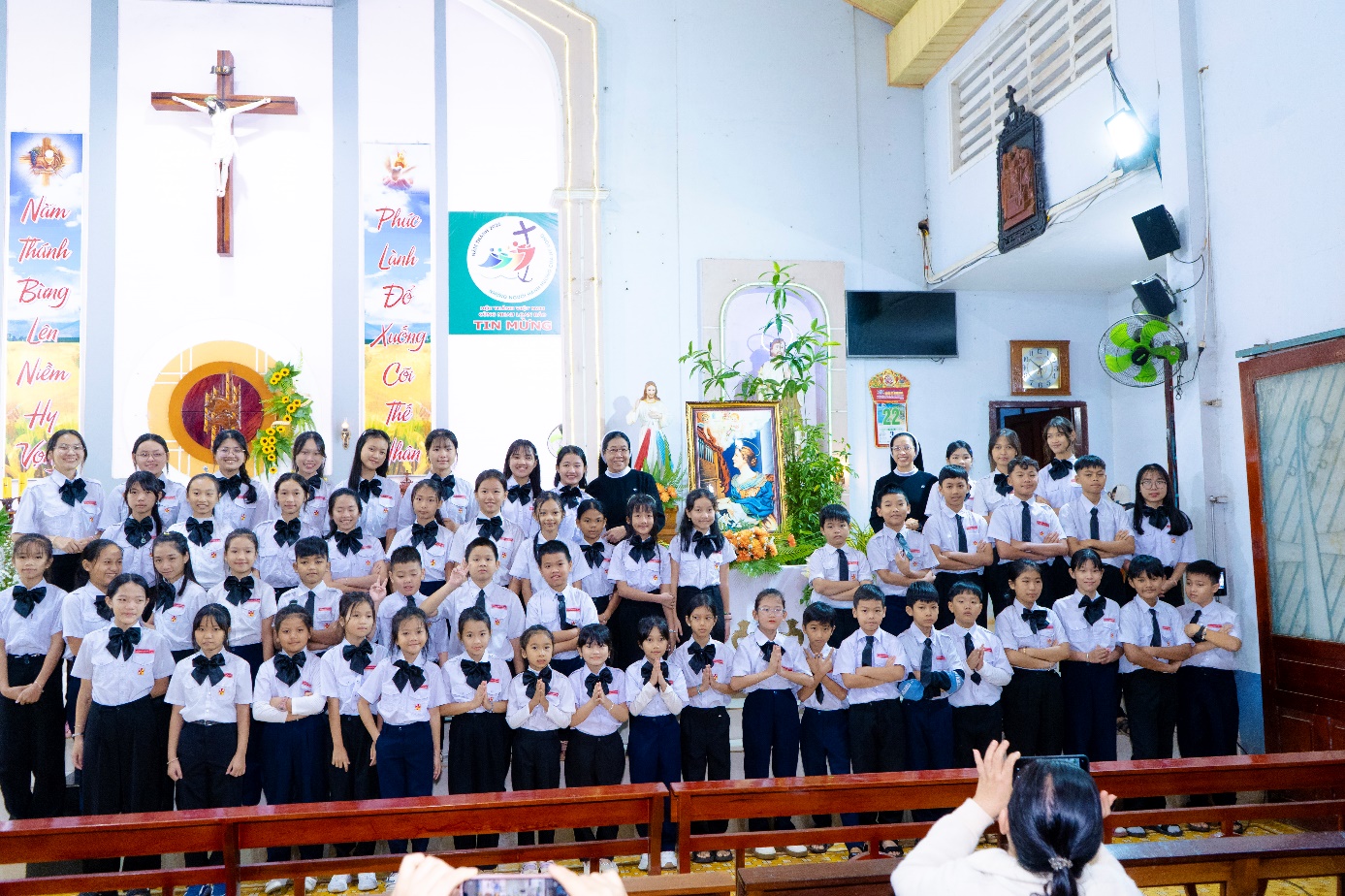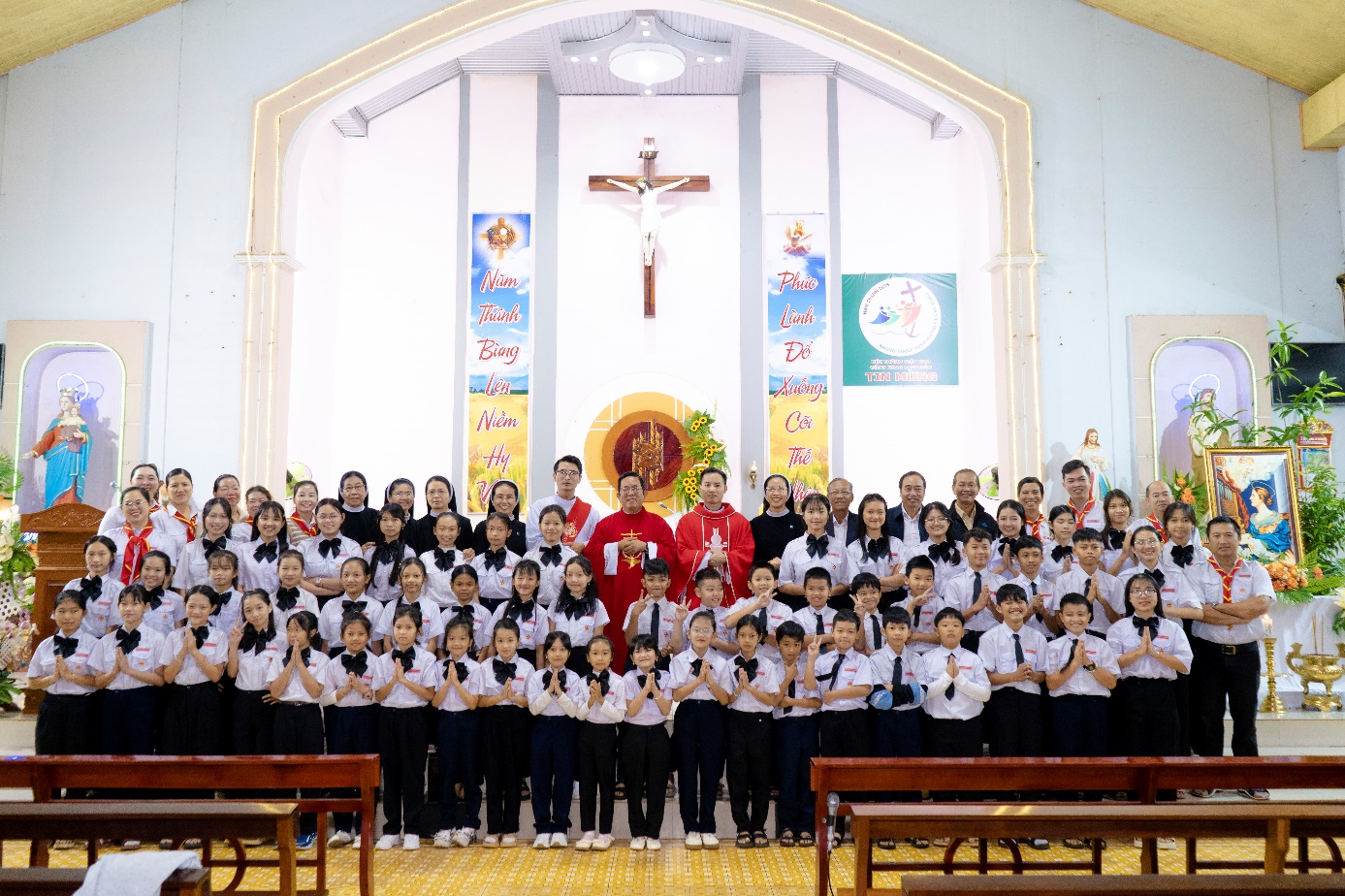 Kết lễ các em chụp ảnh lưu niệm cùng quý Cha, quý Soeurs, quý Ban Thường vụ HĐGX và các anh chị Giáo lý viên.