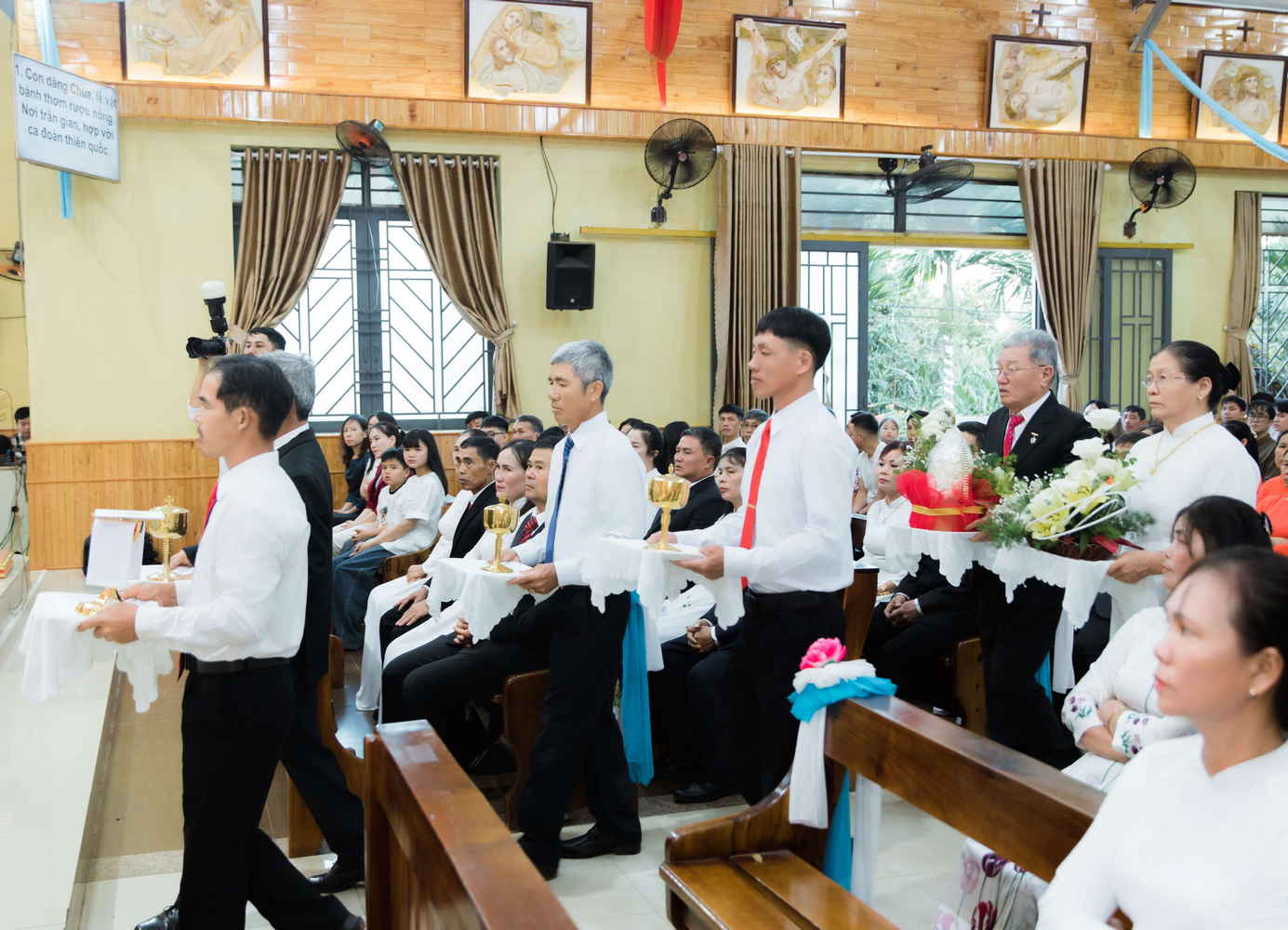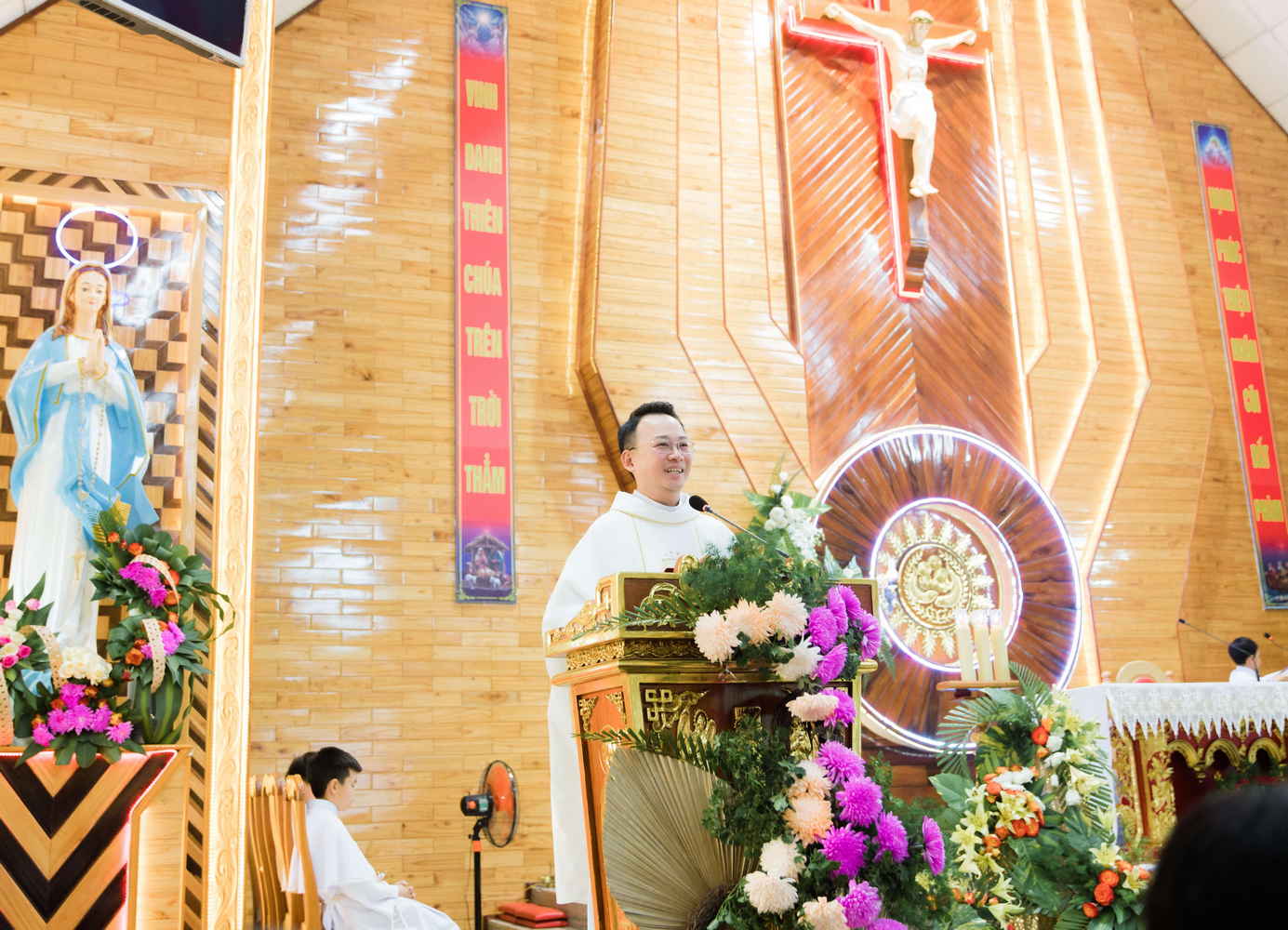 Thánh lễ do Cha Quản nhiệm Gioan Baotixita Đinh Văn Mạnh Khương – chủ tế. Cùng đồng tế với ngài, có Cha khách Gioan Lasan Maria Nguyễn Quốc Huy. Hiệp dâng trong Thánh lễ này, có quý Soeur Cộng Đoàn Mẹ Trinh Vương, thân mẫu và gia đình của cha Quản nhiệm, Đoàn Gia trưởng, các Hội đoàn, 16 đôi hôn phối và cộng đoàn dân Chúa.