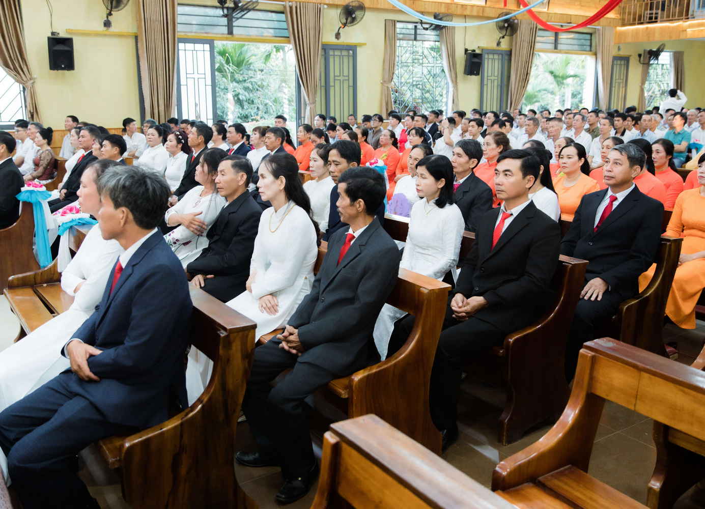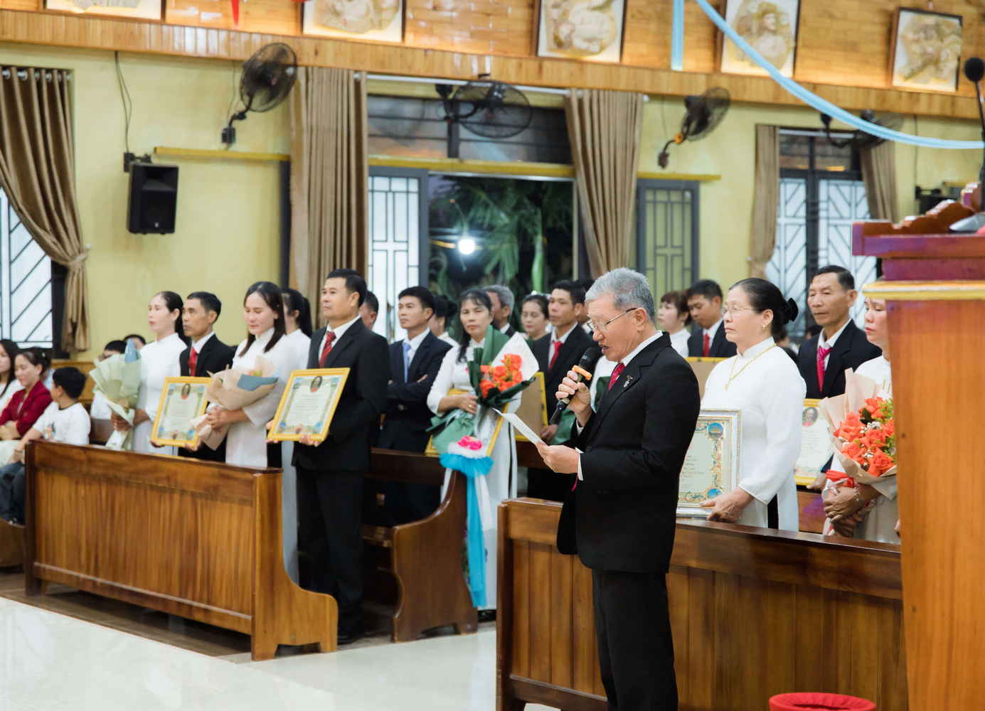 Nối tiếp sau nghi thức là Lời nguyện tín hữu, Tiến dâng lễ vật và Phụng vụ Thánh Thể. Cuối phần Hiệp lễ, quý cha đã tiến hành trao Phép lành của Tòa Thánh do Đức Thánh Cha Lê-ô XIV ban cho 16 đôi kỷ niệm hôn phối.