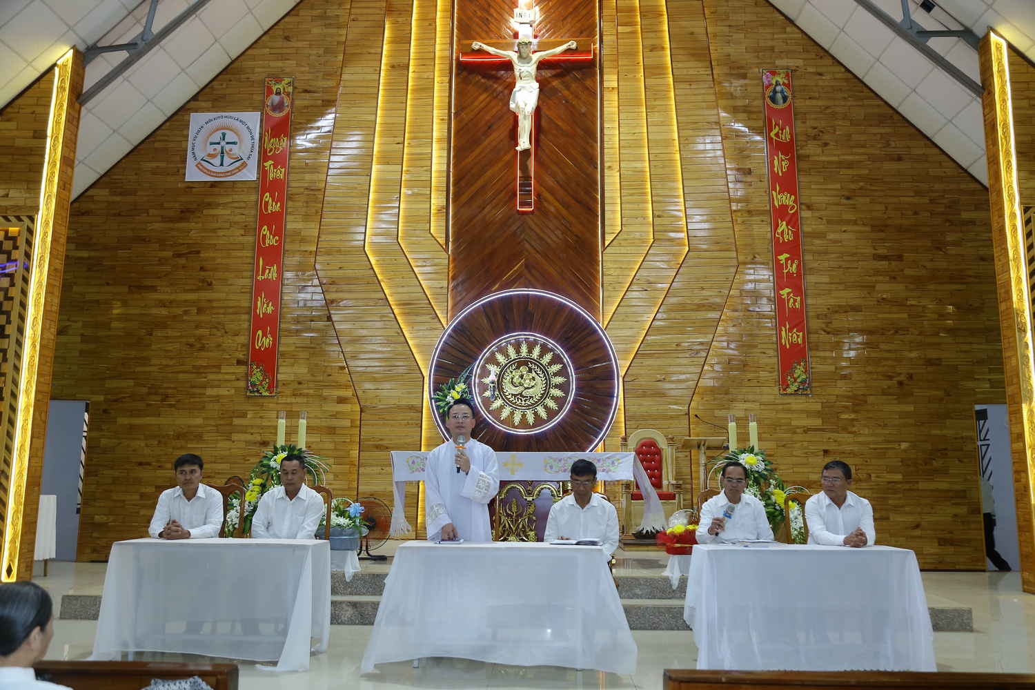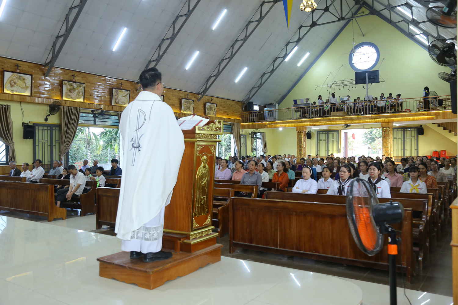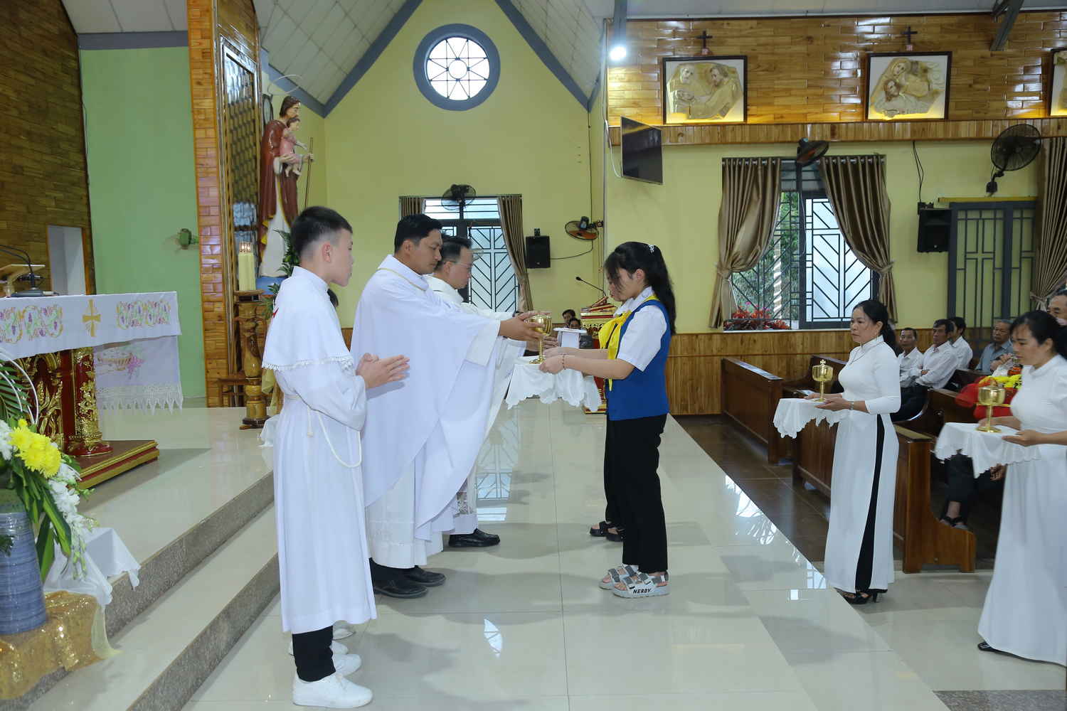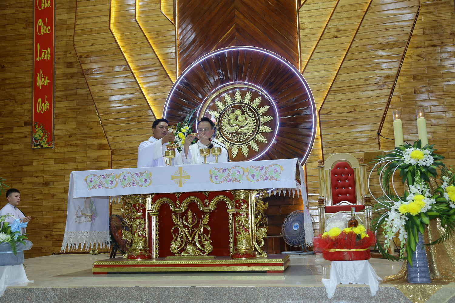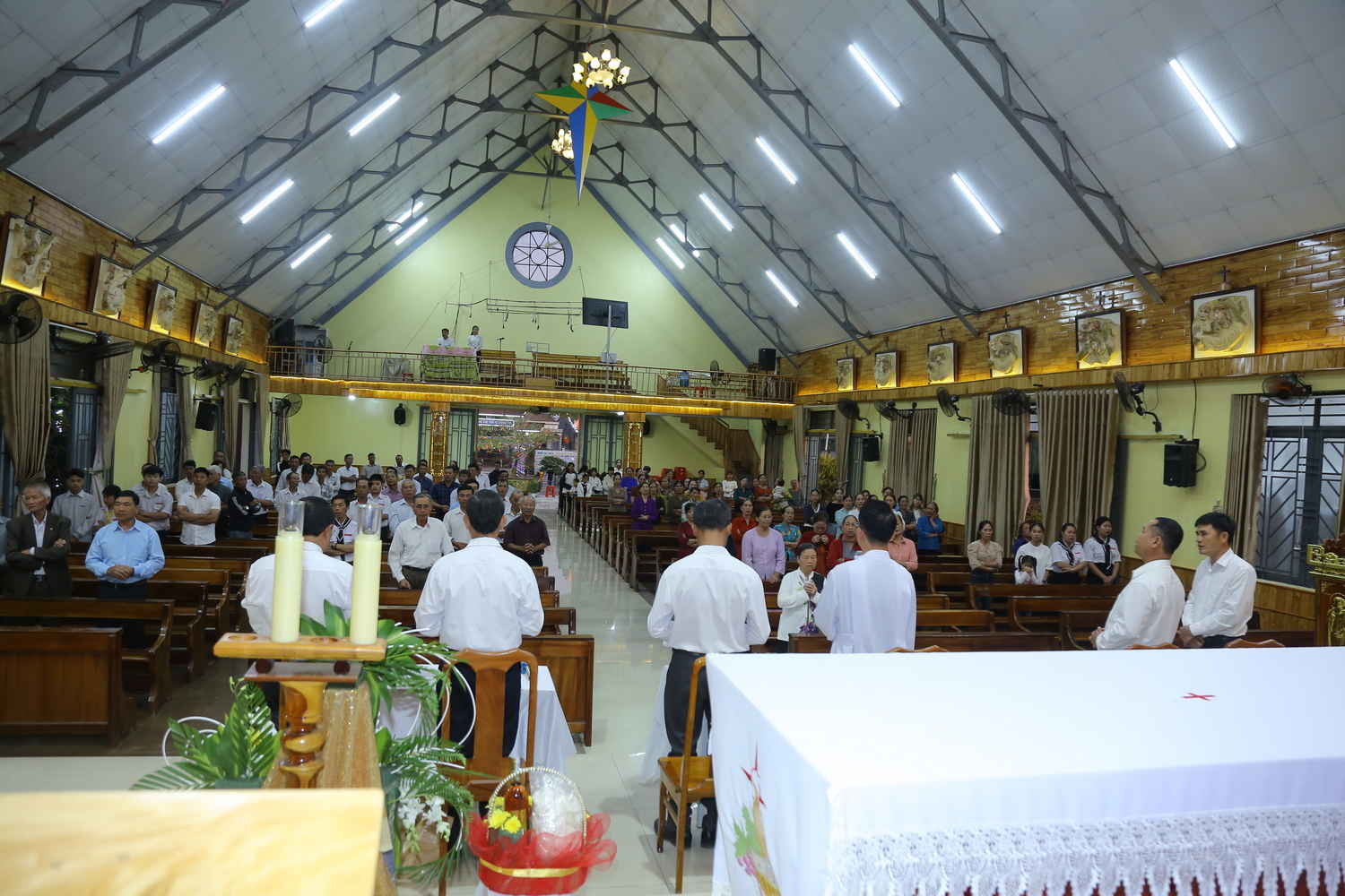 Ngay từ sớm, khuôn viên nhà thờ đã rộn ràng tiếng cười nói. Những tà áo dài thướt tha, những gương mặt rạng rỡ của những người con xa quê vừa trở về, tạo nên một bức tranh sum vầy ấm áp. Tiếng trống kèn âm vang làm cho bầu khí trước Thánh lễ được khấp khởi mừng lên. Thánh lễ được cử hành lúc 17h00’, do Cha Quản nhiệm Gioan Baotixita Đinh Văn Mạnh Khương chủ tế. Đồng tế với ngài, có Cha Gioan Lasan Maria Nguyễn Quốc Huy. Cùng hiệp dâng Thánh lễ có quý Soeur, các Hội đoàn và cộng đoàn dân Chúa.