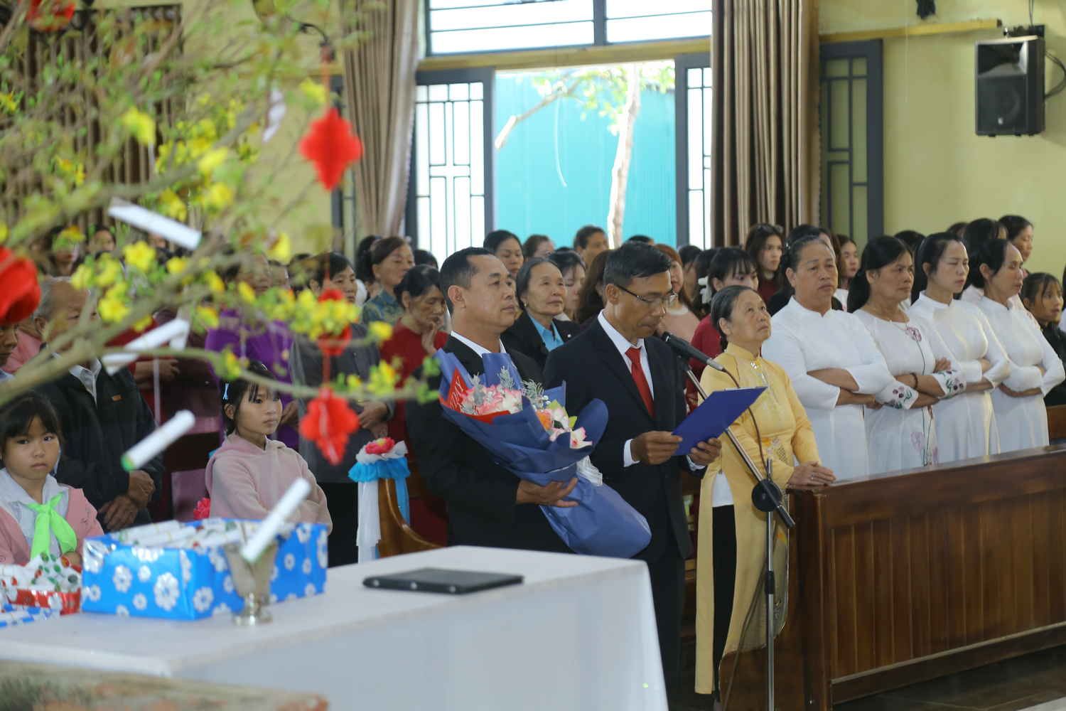 Ngay từ sớm, khuôn viên nhà thờ đã rực rỡ sắc màu của hoa và những tà áo dài. Tiếng chuông nhà thờ ngân lên, tiếng trống kèn nối tiếp hòa vang, tạo nên bầu khí rộn ràng, vui tươi đậm chất mùa xuân. Gác lại những lo toan của năm cũ để bước vào ngưỡng cửa năm mới với niềm tín thác. Đúng vào lúc 6h00, Thánh lễ Cầu bình an cho năm mới được cử hành cách trọng thể, do Cha Gioan Baotixita Đinh Văn Mạnh Khương, Quản nhiệm Giáo họ chủ tế. Trong tiếng hát nhịp nhàng trong trẻo của ca đoàn, đoàn rước từ cuối nhà thờ tiến lên Cung Thánh.