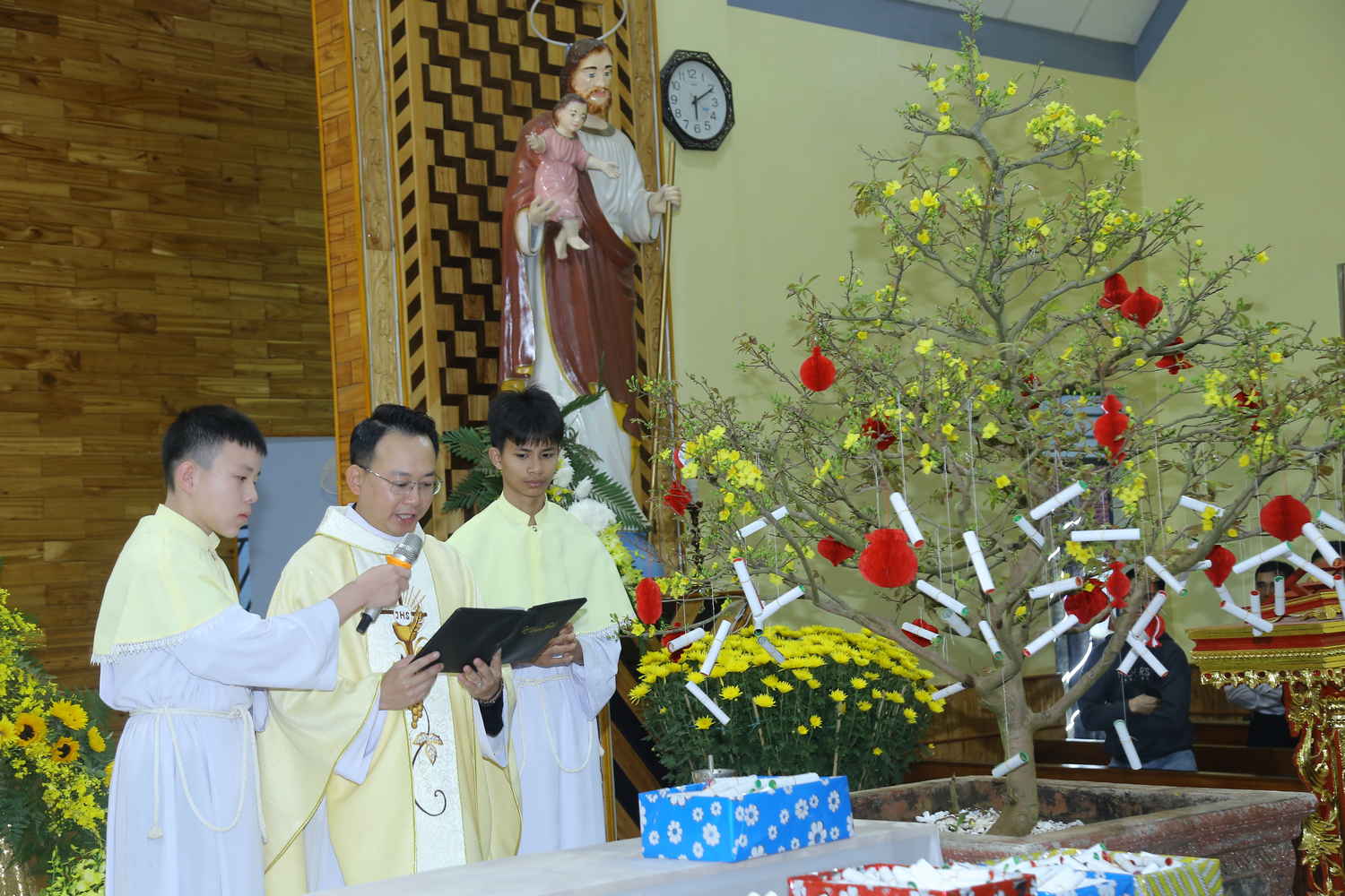 Sau nghi thức xông hương bàn thờ đầy trang nghiêm để chuẩn bị cho bàn tiệc Thánh. Cha Gioan Baotixita đã chủ sự nghi thức làm phép Lộc Thánh đầu xuân, đó là những kim chỉ nam bằng Lời Chúa cho mỗi người trong 1 năm mới. Đại diện quý Soeur và các Hội đoàn lên hái những Lộc đầu tiên.