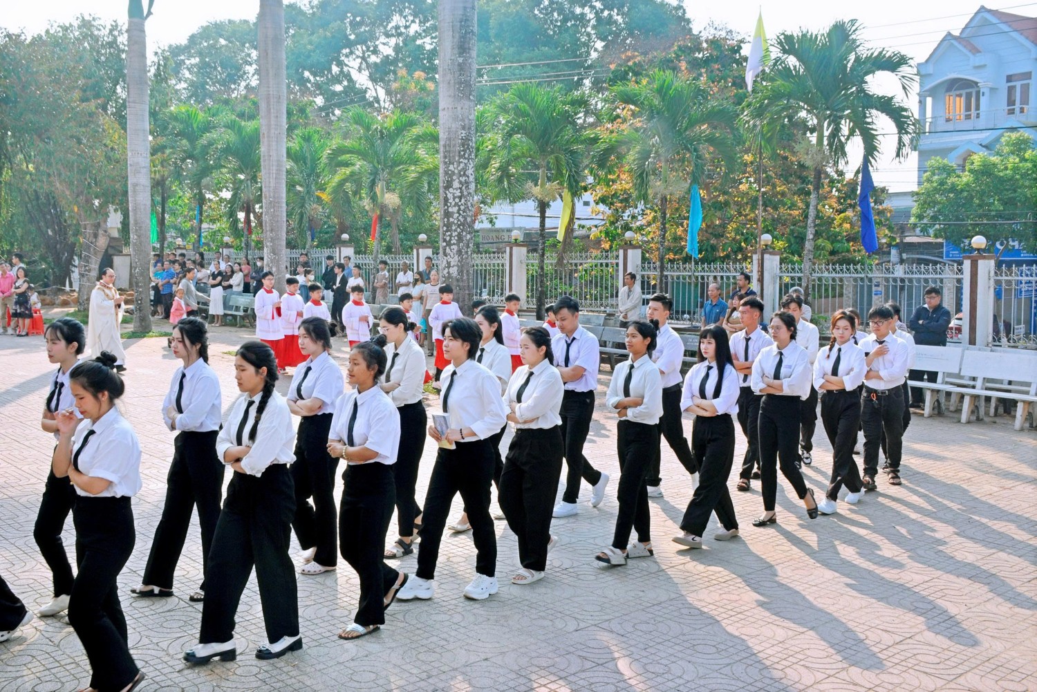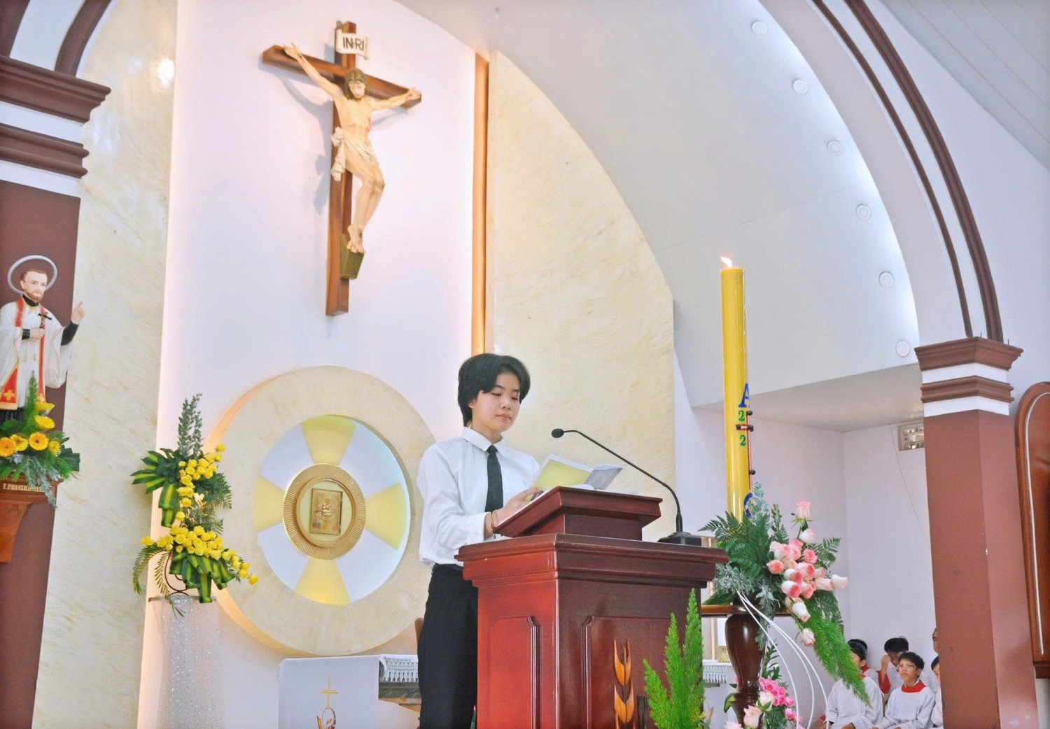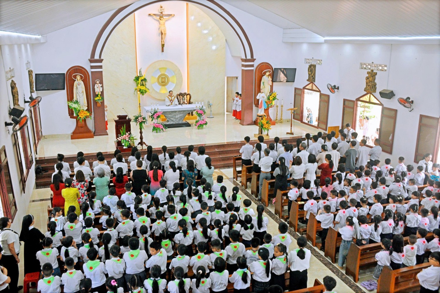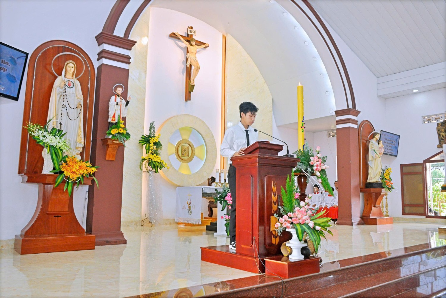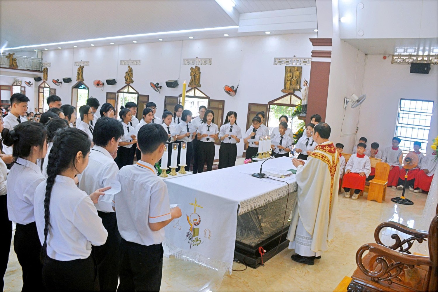 Mở đầu Thánh lễ, Cha Quản xứ Tôma Aquinô mời gọi cộng đoàn hiệp ý cầu nguyện cách đặc biệt cho các bạn trẻ: “Sau một chặng đường dài học hỏi Giáo lý, các em đã có đủ hành trang để bước vào đời, làm chứng cho Chúa và dấn thân phục vụ. Xin Chúa ban nhiều ơn lành để các em luôn vững bước trên hành trình mới bắt đầu hôm nay.”
