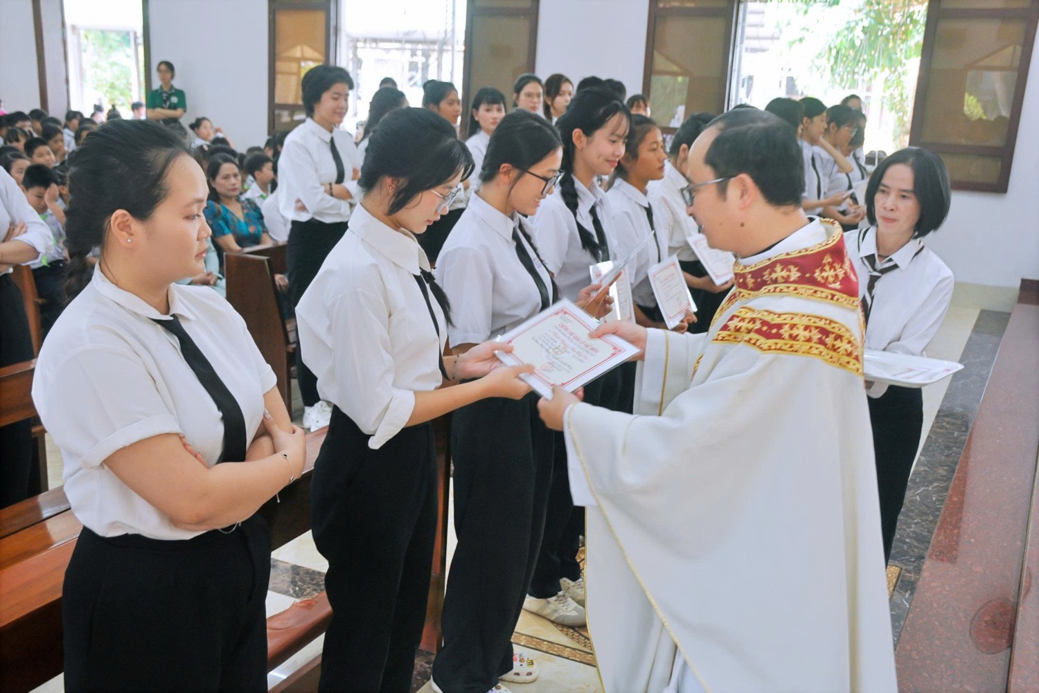 Sau lời nguyện hiệp lễ, Cha Quản xứ Tôma Aquinô đã trao chứng chỉ Vào Đời cho các bạn vừa tuyên hứa, ghi nhận chặng đường 12 năm học hỏi và trưởng thành trong đức tin.