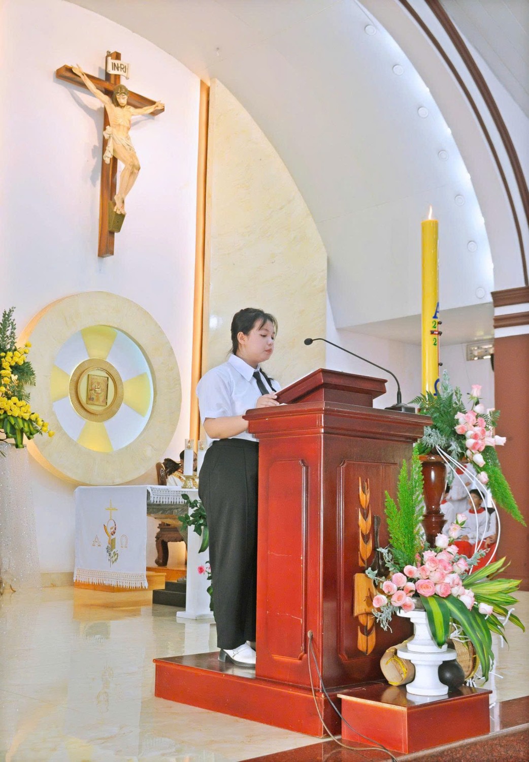 Đại diện lớp Vào Đời lên đường dâng lời tri ân đến quý Cha, quý Sơ, Hội đồng Giáo xứ, quý phụ huynh và các anh chị Giáo lý viên, đồng thời chia sẻ tâm tình với toàn thể các em Giáo lý sinh. Thánh lễ khép lại trong bầu khí trang nghiêm và đầy xúc động với những lời nhắn nhủ yêu thương của Cha Tôma Aquinô. “Trên hành trình bước vào đời, các con cần có một Đấng đồng hành, đó là Chúa Giêsu. Dù ở bất cứ nơi đâu, hãy luôn cố gắng tham dự Thánh lễ và giữ sự gắn kết với gia đình.”
