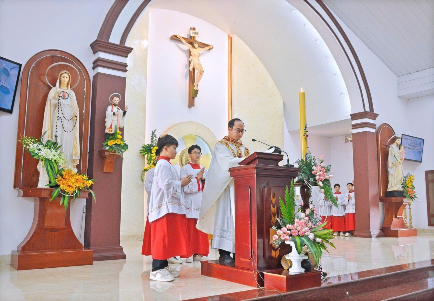 Sau bài Tin Mừng Chúa nhật II Phục Sinh, Cha chủ tế đã chia sẻ Lời Chúa với cộng đoàn, cách riêng với các bạn trẻ trong ngày lên đường. Trong bối cảnh lễ kính Lòng Thương Xót Chúa, Cha nhấn mạnh đến sự hiện diện sống động của Thiên Chúa qua những vết thương phục sinh – dấu chỉ của tình yêu cứu độ và lòng thương xót vô biên. Cha giúp cộng đoàn hiểu rằng việc “nhìn thấy Chúa” không chỉ bằng đôi mắt thể lý, nhưng còn bằng trí tuệ và con tim. Chính nhờ cái nhìn đức tin ấy, con người nhận ra lòng thương xót của Thiên Chúa ẩn chứa trong những đau khổ mà Ngài đã gánh chịu vì nhân loại. Từ hình ảnh những vết sẹo của Đức Kitô, Cha liên hệ đến đôi bàn tay chai sần của cha mẹ, đến những vất vả của những người thợ xây – những minh chứng cụ thể cho tình yêu hy sinh và lòng vị tha trong đời sống thường ngày. Qua đó, Cha mời gọi các bạn trẻ bước vào hành trình mới với niềm tin yêu, trở nên những chứng nhân của lòng thương xót bằng đời sống cảm thông, sẻ chia và chữa lành những tổn thương nơi tha nhân.