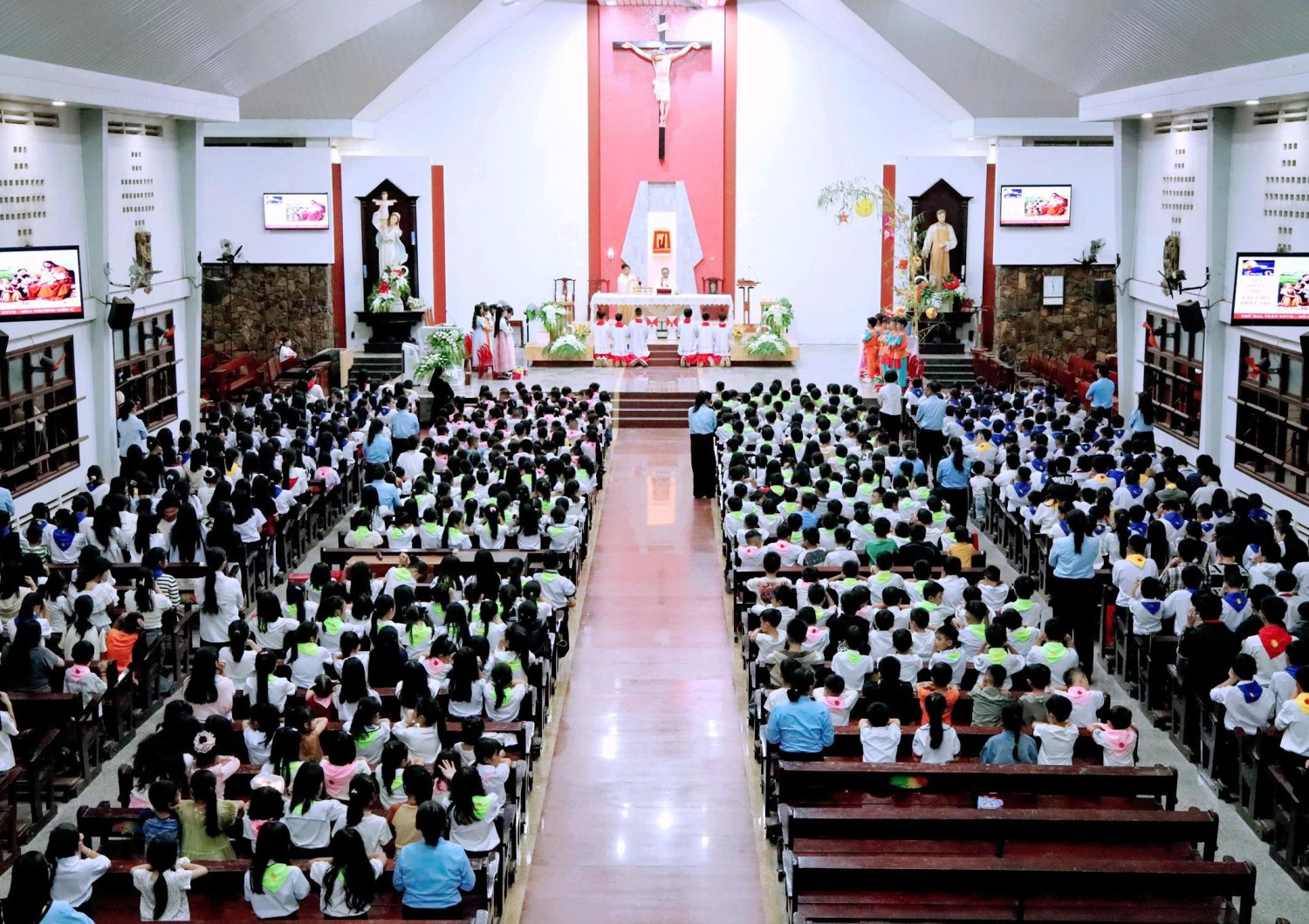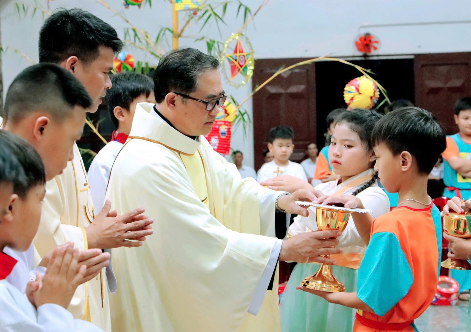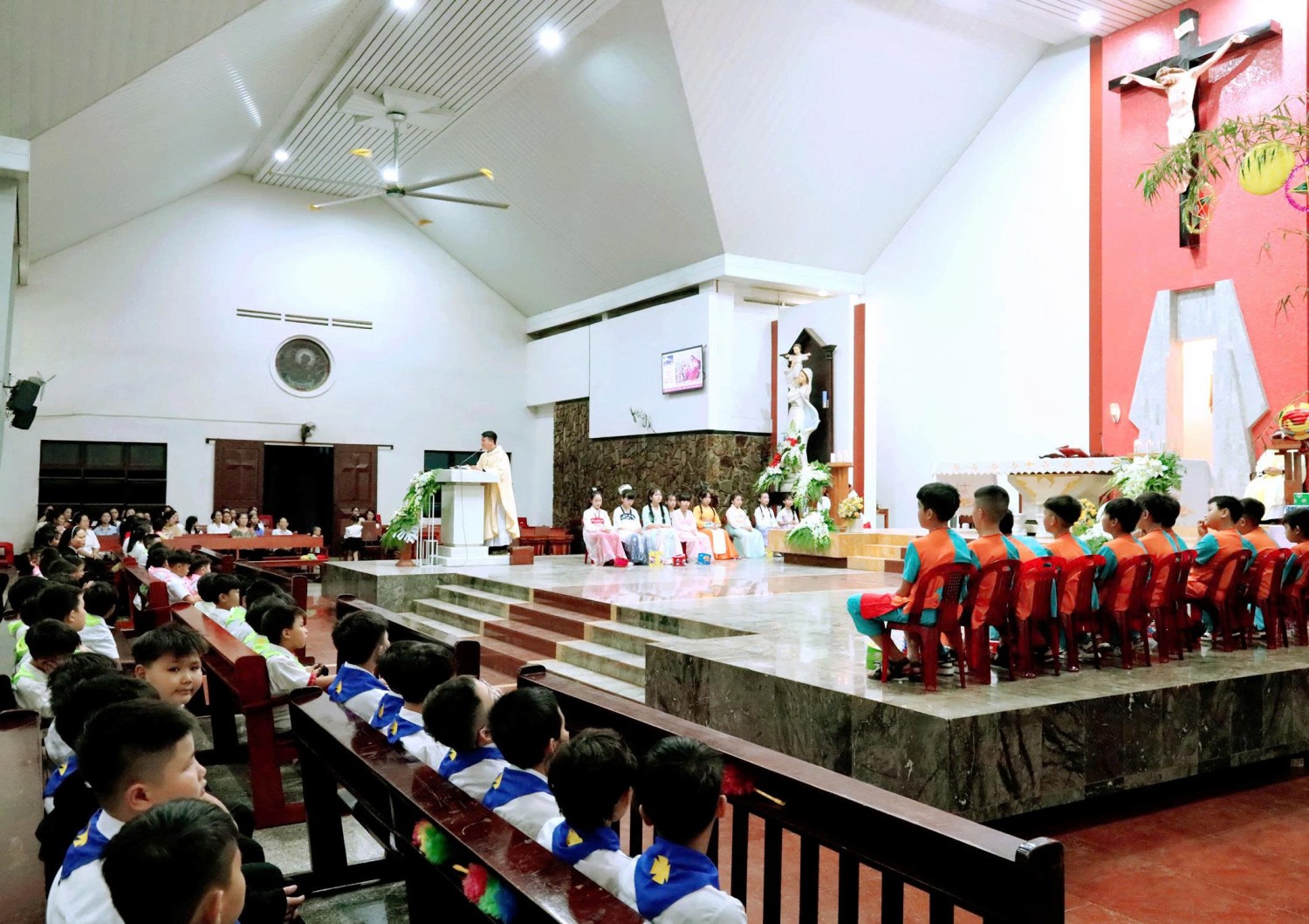 Mở đầu và kết thúc Thánh lễ, Cha Quản xứ đã chúc mừng các em Thiếu nhi và mong ước: ”Các con, càng lớn, thêm tuổi, càng thêm khôn ngoan trước mặt Chúa và mọi người”.