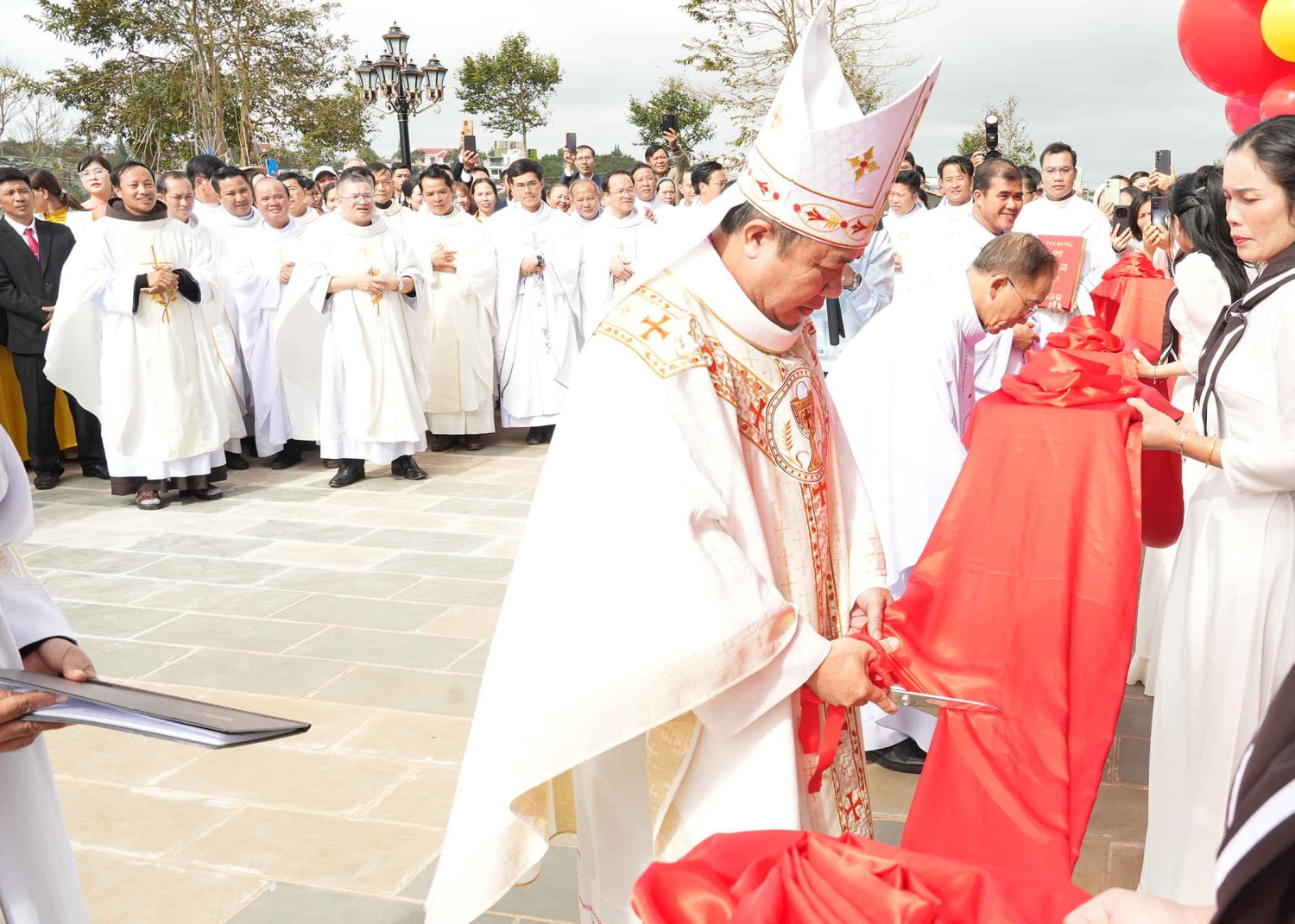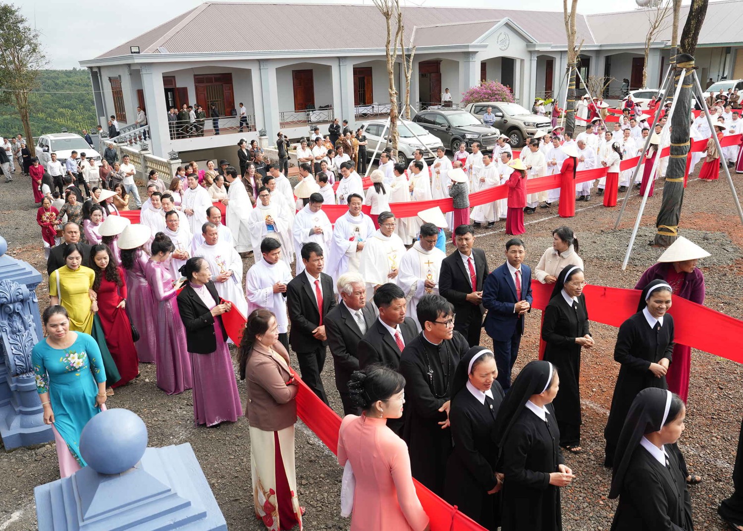 10 giờ 45 - Thánh lễ tạ ơn, Khánh thành Nhà thờ Giáo xứ Hòa Tiến kết thúc. Đức Cha, quý Cha cùng chụp hình lưu niệm và ở lại chung niềm vui với giáo xứ trong bữa tiệc mừng.
