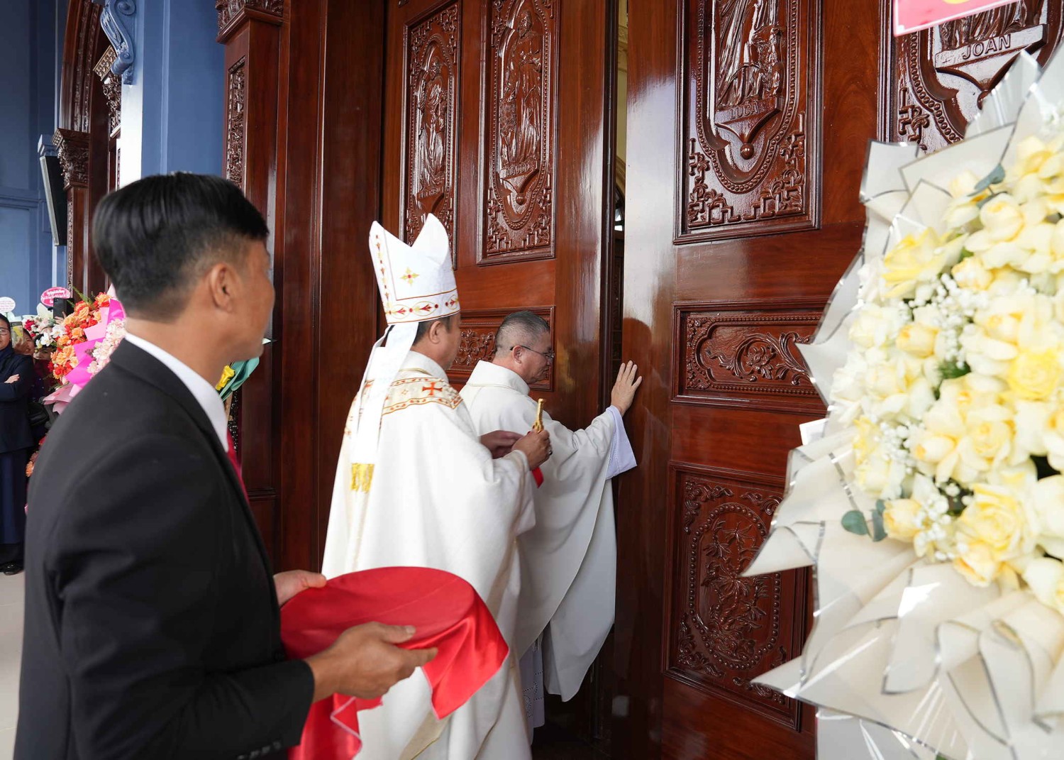 9 giờ 15 - trong tiếng kèn, tiếng trống rộn ràng, đoàn rước tiến vào tiền sảnh Nhà thờ. Tại đây, Đức Cha Gioan Baotixita, Cha Tổng Đại diện, hai Cha Quản hạt Gia Nghĩa và Mẫu Tâm cắt băng khánh thành. Sau đó, Đức Cha mở cửa Nhà thờ và trao chìa khóa lại cho Cha Quản xứ Hòa Tiến – Đaminh Lê Văn Thế. Đây là dấu chỉ tượng trưng cho việc Đức Cha trao quyền quản lý ngôi Thánh đường Giáo xứ Hòa Tiến cho Cha Quản xứ.