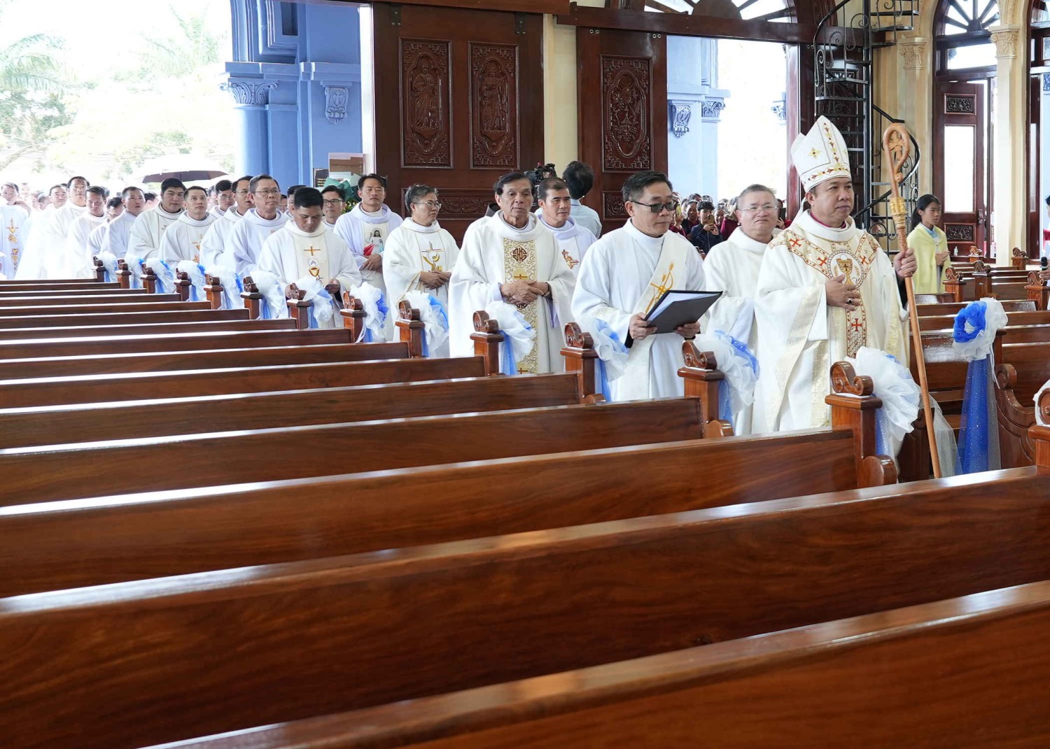 “Cửa ơi! Hãy cất đầu lên, để Vua vinh quang ngự qua…” lời ca nhập lễ vang lên như tha thiết mời gọi địa cầu và muôn loài, thế giới và chư dân tiến vào Thánh Điện. Đức Cha, quý Cha và cộng đoàn hân hoan tiến vào Thánh đường hiệp dâng Thánh lễ.
