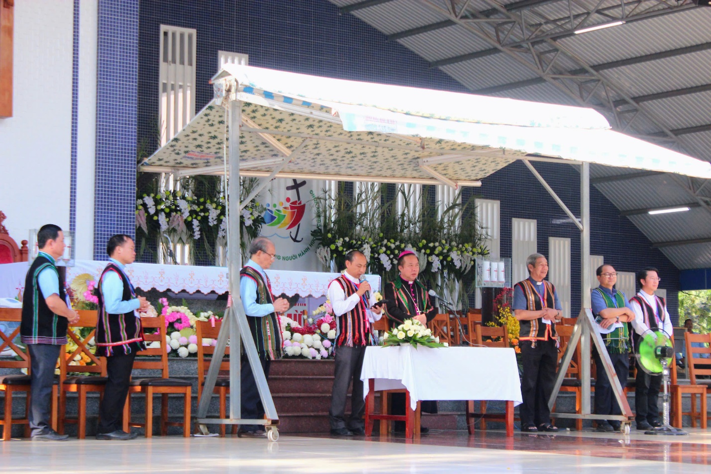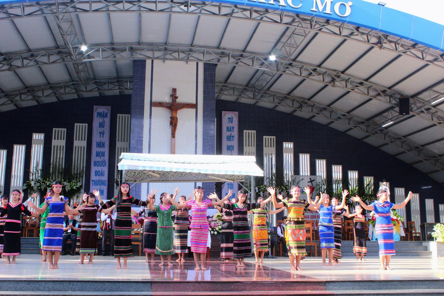 Trong bầu khí linh thiêng, từng nhịp điệu cồng chiêng hòa quyện cùng lời ca của anh chị em ca viên Sắc tộc trong bài ca nhập lễ, giúp cộng đoàn tham dự bước vào Thánh lễ một cách thật trang nghiêm và sốt sắng.