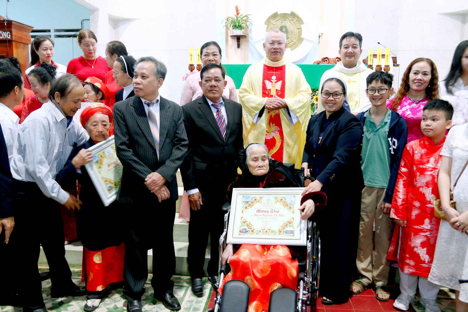 Kế tiếp, quý Cha trao bằng mừng thọ và quà cho 71 Cụ trong độ tuổi 80 thuộc 7 Giáo họ trong Giáo xứ. Nguyện xin Chúa chúc lành cho quý Ông bà tiếp tục sống, và sống mạnh khỏe cùng với con cháu trong an bình suốt phần đời còn lại.